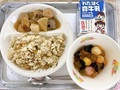 9月19日(金)の給食【郷土料理~兵庫県~ とふ飯、姫路おでん、白玉入り黒豆のみつ豆、牛乳】