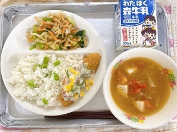 9月10日(水)の給食【枝豆ご飯、ホキの梅マヨソースかけ、トマ豚みそ汁、切干大根のサラダ、牛乳】