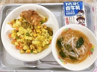 9月22日(月)の給食【世界の料理~ミャンマー~ ダンバウ(タンドリーチキンのせ)、シャンヌードル、牛乳】