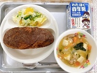 9月24日(水)の給食【ココア揚げパン、豆腐のスープ煮、夏みかんサラダ、牛乳】
