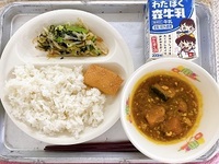 9月25日(木)の給食【白飯、いかのスタミナ焼き、かぼちゃのそぼろあんかけ、磯香和え、牛乳】