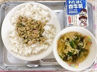 10月1日(水)の給食【ぎょうざ丼(麦ご飯)、かきたま春雨スープ、牛乳】
