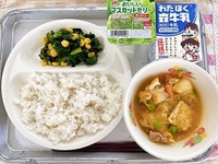 10月2日(木)の給食【麦ご飯、キムチチーズ肉じゃが、小松菜とわかめのサラダ、マスカットゼリー、牛乳】