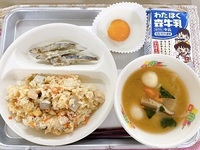 10月6日(月)の給食 十五夜献立【十五夜ご飯、きびなご唐揚げ、いも団子汁、おかしな目玉焼き、牛乳】