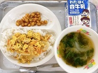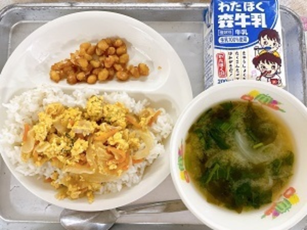 10月9日(木)の給食【親子丼(麦ごはん)、大豆のしゃりしゃり揚げ、だしを感じるみそ汁、牛乳】