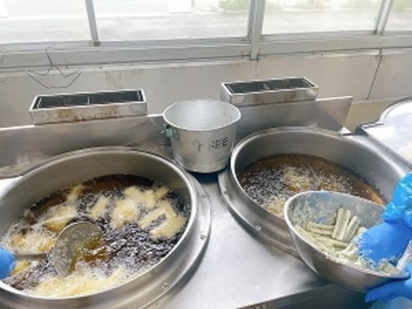 ちくわの磯辺揚げは、給食室でちくわを4等分に切り、青のりの入った衣を全面にしっかりとつけて、油でからっと揚げています。磯辺とは、のりを使った料理につけられる呼び名です。「磯辺揚げ」、「磯辺焼き」、刻みのりを野菜に和えた「磯辺和え」などがありますね。