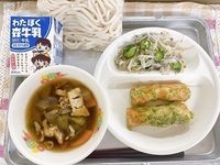 10月14日(火)の給食【なす南蛮うどん(地粉うどん)、ちくわの磯辺揚げ、ゆかり和え、牛乳】