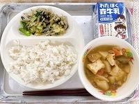 10月16日(木)の給食【麦ご飯、厚揚げと里芋のごまみそ煮、磯香和え、牛乳】