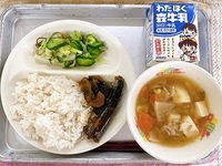 10月20日(月)の給食【麦ご飯、さんまの生姜煮、豚汁、昆布和え、牛乳】
