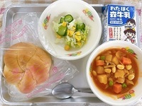 今日のパンは、埼玉県でとれた「にんじん」のペーストを練りこんだ「キャロットパン」です。また、埼玉県産の小麦粉が50%使われています。埼玉県で生産されている小麦粉の「さとのそら」という品種です。給食に出るうどんもこの小麦粉から作られています。味わっていただきましょう!