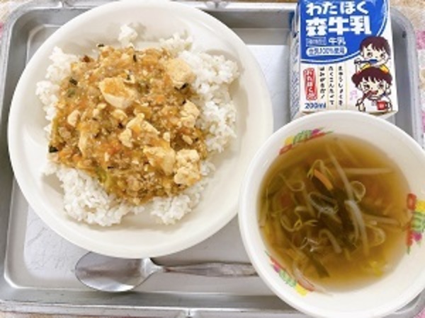 11月5日(水)の給食【マーボー丼(麦ご飯)、茎わかめのかみかみスープ、牛乳】