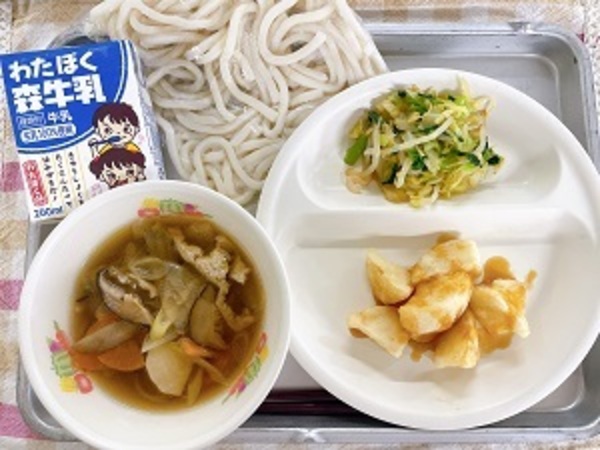 11月12日(水)の給食【おっきりこみうどん(地粉うどん)、みそポテト、おひたし、牛乳】