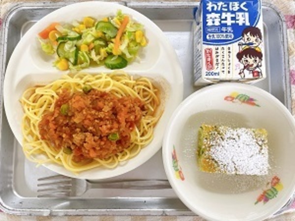 向小の秋の読書週間に合わせて、今日は、ブック給食です。「スパゲッティがたべたいよう」という本に登場する「おひさまいろのスパゲッティ」をつくりました。どんなお話なのかは、この後、図書委員さんに放送してもらいます。おひさまいろのミートソースのかかったスパゲッティをぜひ味わってくださいね!