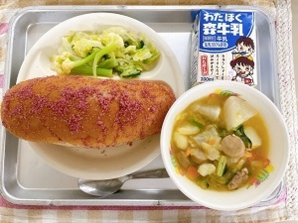 11月18日(火)の給食【ビーツ揚げパン、ポトフ、カリフローレサラダ、牛乳】