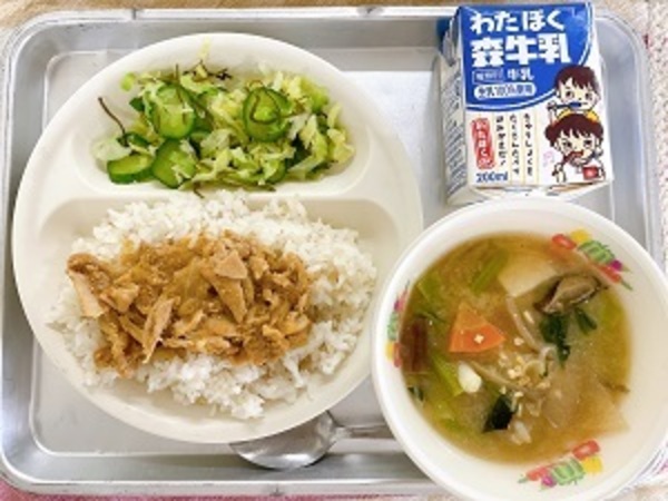 11月19日(水)の給食【東松山やきとり丼、川島呉汁、昆布和え、牛乳】