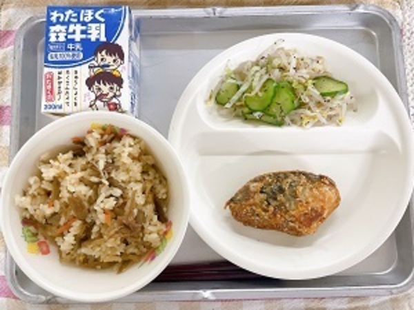 11月25日(火)の給食【かてめし、さばの竜田揚げ、ゆかり和え、牛乳】