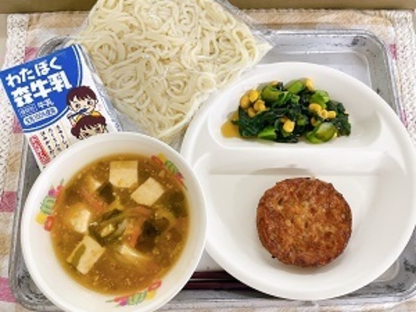 11月26日(水)の給食【岩槻豆腐ラーメン(ホット中華めん)、ねぎ焼き、小松菜とわかめのサラダ、牛乳】