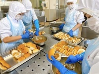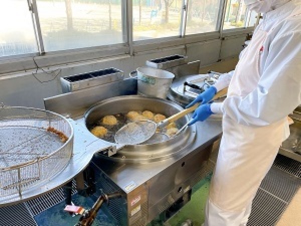 向小の給食の人気メニューである「カレーパン」を給食室で手作りしました。パンはいつも届けてくれるパン屋さんにお願いし、カレーの具をはさみ、小麦粉などで作ったバッター液をぬって、パン粉とパセリをまぶし、油で揚げてつくります。もちろん中にはさむカレーも向小の給食室で手作りしましたよ。