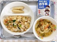 12月5日(金)の給食【韓国風炊き込みご飯、わかさぎフリッター、卵ときくらげのスープ、牛乳】