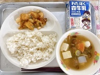 12月8日(月)の給食【麦ご飯、ホキと高野豆腐の甘辛揚げ、みぞれ汁、牛乳】