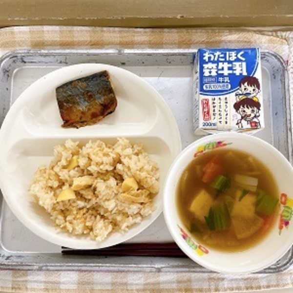 12月10日(水)の給食【くわいご飯、さばのピリ辛焼き、けんちん汁、牛乳】