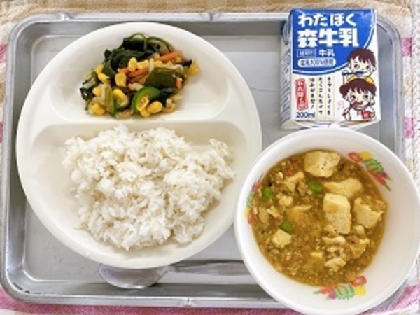 給食によく登場するマーボー豆腐ですが、今日は、ちょっと変わったカレー味のカレー麻婆豆腐です。