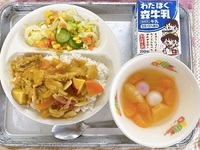 今日は、冬野菜カレーです。給食のカレーは、一年に何度も出ますが、季節によって使う野菜を変えています。冬野菜カレーには、冬に旬を迎える「れんこん」、「だいこん」といった根菜が入ります。冬野菜をしっかり食べて、寒い冬も元気に過ごしたいですね。