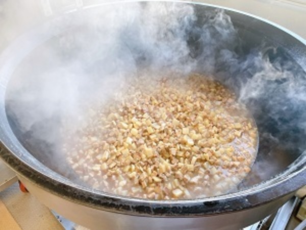 今日は、新献立の「豚角煮丼」です。豚の角煮は、鎖国時代に海外と交流のあった長崎に伝わった中華料理の「東坡肉」を日本風にアレンジした料理です。豚肉を四角く切り、長時間かけて甘辛い醤油ベースのタレでじっくりと煮込んで作ります。味をしっかりとなじませるために、豚肉をゆでて、湯をこぼし、味のなじみにくい脂の部分を出しています。そのあと、調味料と煮詰めて味を入れています。調理員さんが、しっかりと時間をかけて、丁寧に調理してくれたので、おいしくご飯が進む味に仕上がっています。味わっておいしくいただきましょう!