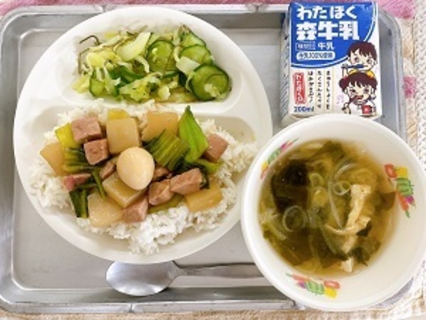 1月13日(火)の給食【豚角煮丼、玉ねぎと油揚げのみそ汁、昆布和え、牛乳】