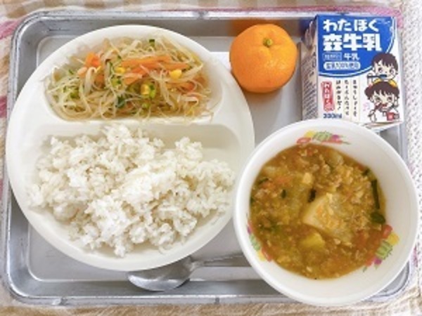 1月16日(金)の給食【麦ご飯、マーボー大根、春雨サラダ、みかん、牛乳】