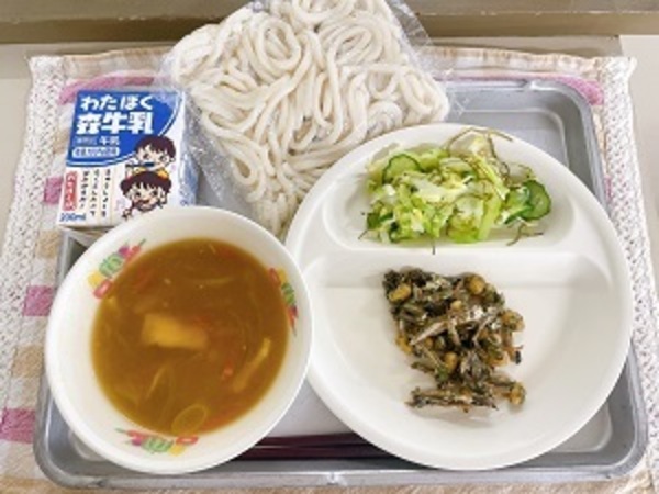 2月16日(月)の給食【カレーうどん(地粉うどん)、大豆と小魚の青のり風味、昆布和え、牛乳】