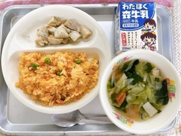 2月17日(火)の給食【チキンライス、ツナと里芋の香草ソテー、野菜スープ、牛乳】