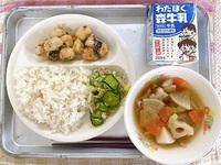 2月18日(水)の給食【麦ご飯、ぶりのみぞれ和え、根菜汁、ゆかり和え、牛乳】