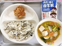 2月26日(木)の給食【わかめご飯、鶏肉のから揚げ、根菜ごまキムチ汁、牛乳】