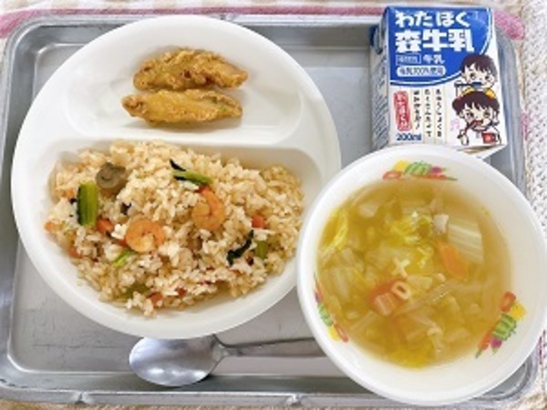 3月9日(月)の給食【えびと青菜のピラフ、わかさぎフリッター、ABCスープ、牛乳】