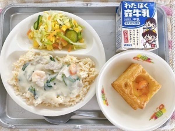 3月13日(金)の給食【キャロットピラフのえびクリームソースかけ、コーンサラダ、手作りフルーツパイ、牛乳】
