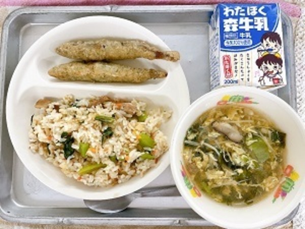 4月13日(月)の給食【焼き豚チャーハン、ししゃもフリッター、かきたまスープ、牛乳】