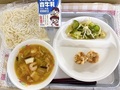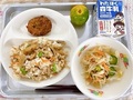 10月29日(水)の給食【広東麺(ホット中華めん)、揚げしゅうまい、茎わかめのピリ辛和え、牛乳】