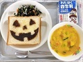 10月31日(金)の給食 ハロウィン献立【ハロウィントースト、パンプキンスープ、ひじきのマリネ、牛乳】