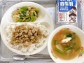 12月3日(水)の給食【れんこん入りそぼろ丼、なめこ汁、こまツナ和え、牛乳】