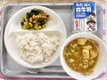 12月12日(金)の給食【麦ご飯、カレー麻婆豆腐、海藻サラダ、牛乳】