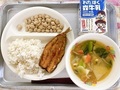 2月3日(火)の給食 節分献立【麦ご飯、いわしのかば焼き、みそけんちん汁、きなこ大豆、牛乳】
