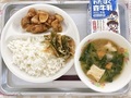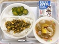 9月8日(月)の給食【麦ご飯、鶏肉とじゃがいもの香味ソース和え、茎わかめのピリ辛炒め、小松菜のみそ汁、牛乳】